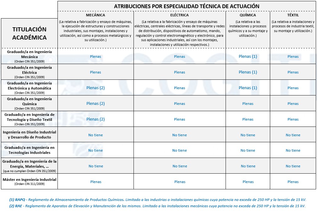 Atribuciones profesionales de los Ingenieros Técnicos Industriales y Grados en Ingeniería conforme a la Orden CIN/351/2009, de 9 de febrero