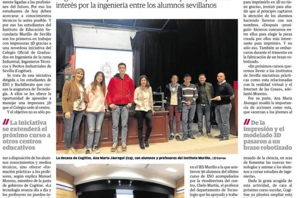 «El Correo de Andalucía» se hace eco del proyecto de COGITI Sevilla para acercar la ingeniería a los estudiantes El periódico El Correo de Andalucía publicó en su edición del pasado lunes, 14 de mayo, un amplio reportaje sobre la iniciativa de Cogitise, el Colegio Oficial de Graduados en Ingeniería de la rama Industrial, Ingenieros Técnicos y Peritos Industriales de Sevilla, para acercar la ingeniería a los estudiantes de Secundaria y Bachillerato a través del manejo de impresoras 3D.