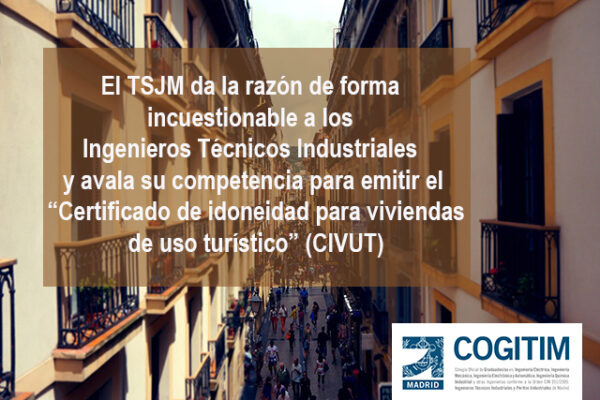 El Tribunal Superior de Justicia de Madrid (TSJM) da la razón de forma incuestionable a los Ingenieros Técnicos Industriales y avala su competencia para emitir el “Certificado de idoneidad para viviendas de uso turístico” (CIVUT) El Colegio Oficial de Graduados e Ingenieros Técnicos Industriales de Madrid (COGITIM) ha conseguido con esta Sentencia, que el Tribunal Superior de Justicia de Madrid, avale la competencia de sus colegiados para emitir el “Certificado de idoneidad para viviendas de uso turístico” (CIVUT), al tiempo que declara NULA la reserva de actividad exclusiva a favor de los arquitectos y arquitectos técnicos para la emisión de dichos certificados, como estaba ocurriendo hasta este momento.