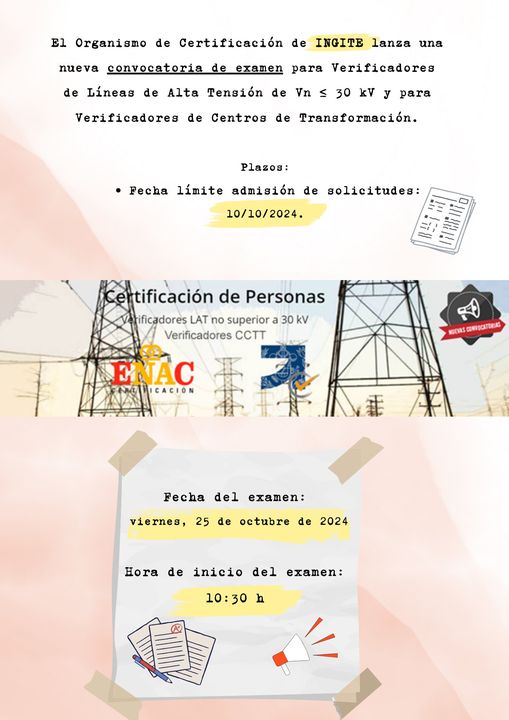 El Organismo de Certificación de INGITE realiza esta nueva convocatoria acorde a la norma UNE-ES ISO IEC 17024, acreditado por ENAC (Número 15/CPE024), y certifica el esquema de certificación de Técnicos Verificados de Líneas de Alta Tensión de Vn no superior a 30 kV, y de Técnicos verificadores de Centros de Transformación, ambos propiedad de COGITI, abierta a todos los profesionales que puedan optar a ello y estén interesados. Existen personas certificadas para ambos esquemas, y pueden consultar sus nombres en la web: www.certing.es